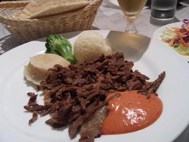 ケバブです。一緒に出てくるパンにはさんで食べます。ケバブは見た目、パサパサっぽかったのだけれど、味がしっかり、しっとりとしていて美味しいです。付き合わせはマッシュポテトとご飯。ご飯はどうやって食べるか迷ったのですが、ケバブと一緒にパンにはさんで食べました。塩味のスープで味がついていて、結構美味しい。